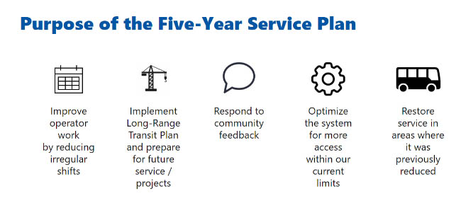 The following outlines the updated draft of the phased 2025-2029 Five-Year Service Plan. This is the framework upon which the plan is built, updated, and refined, before it is finally adopted and implemented. These proposed changes are determined based on community feedback and other inputs, including stakeholder feedback, operational feasibility, workforce capacity and planning, budgetary considerations, community needs, compliance with federal Title VI regulations regarding discrimination, and ongoing analysis of our system, following public comment. We carefully consider the operational cost and feasibility of any potential change.